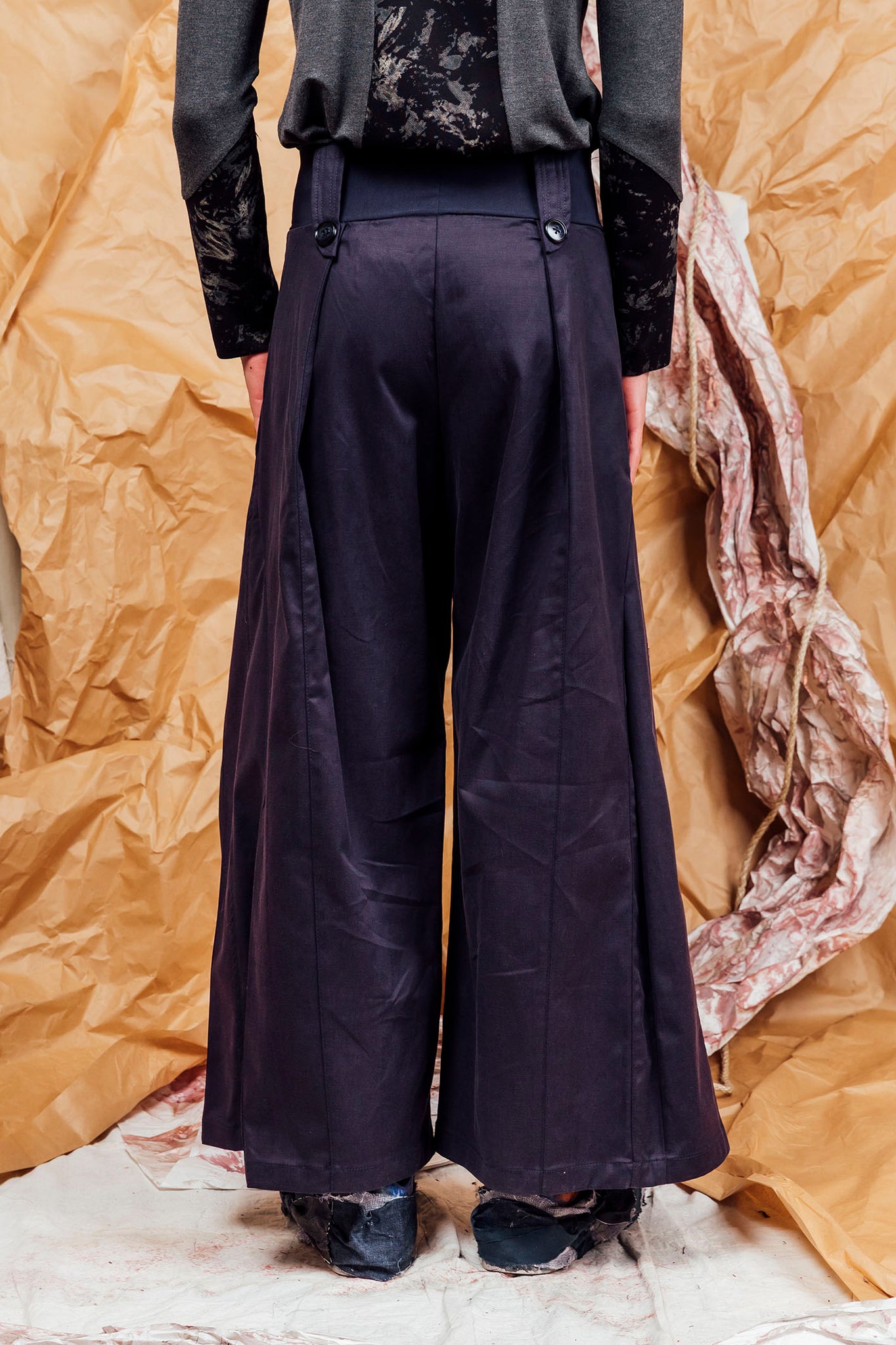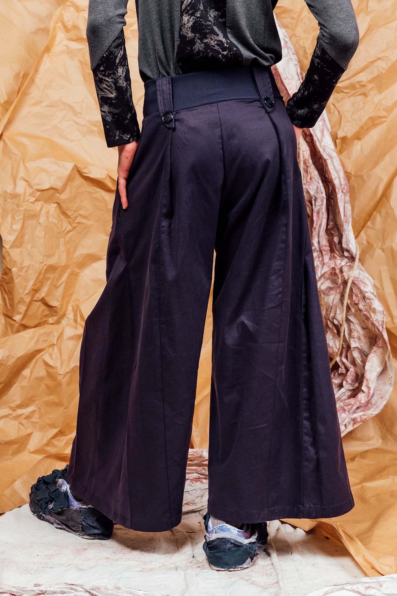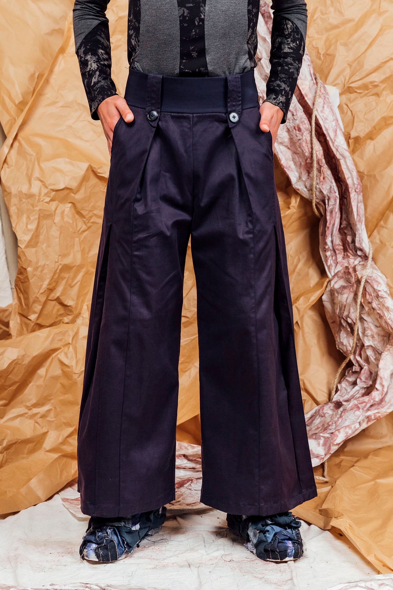 • Wide flared leg with inward pleating details front and back, set in intricate linear panel lines.