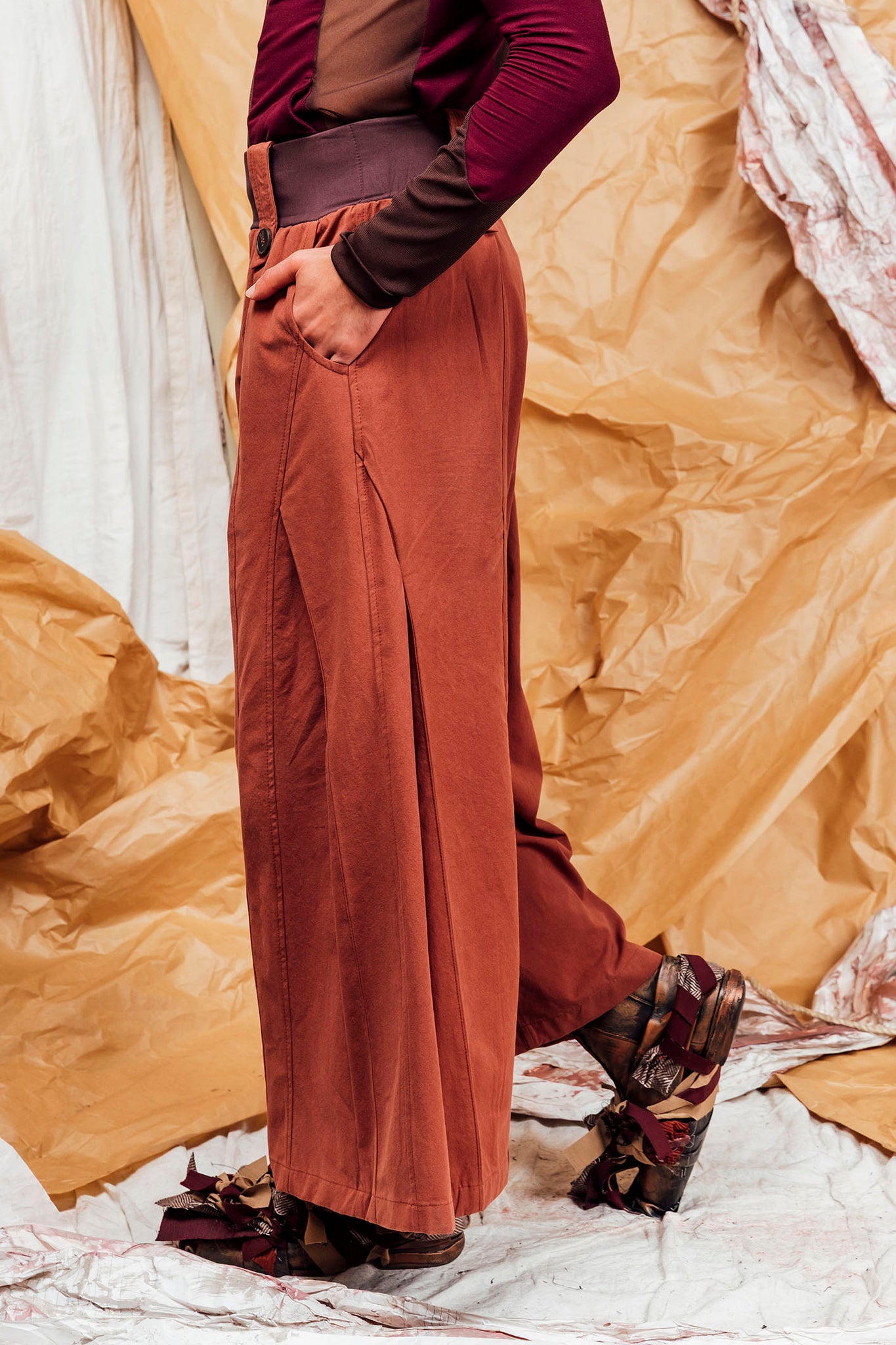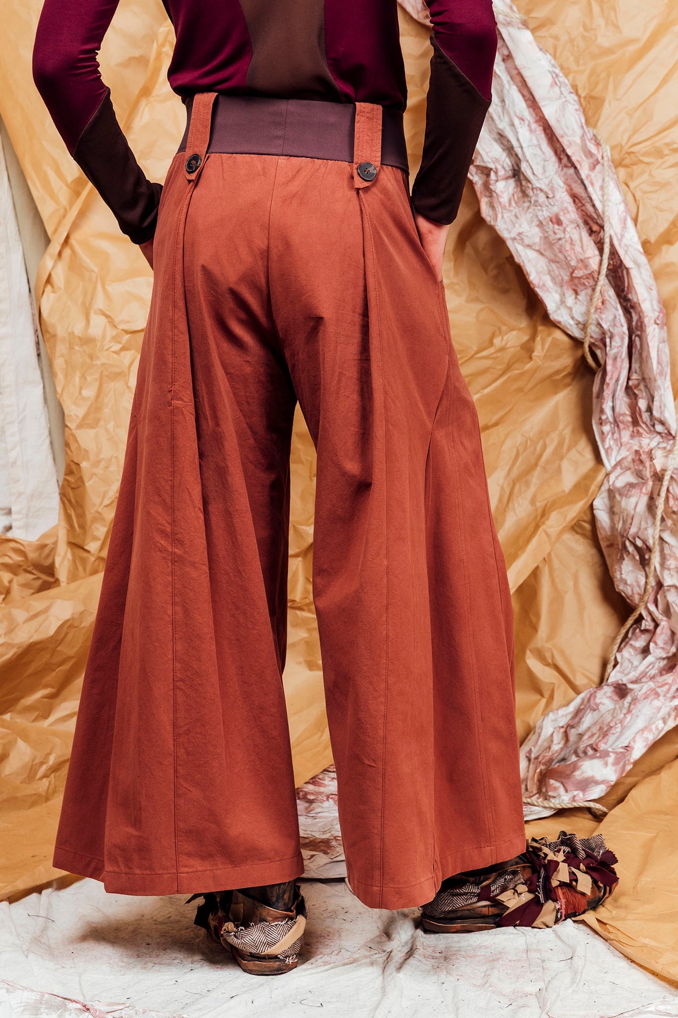 - Wide flared leg with inward pleating details front and back, set in intricate linear panel lines.