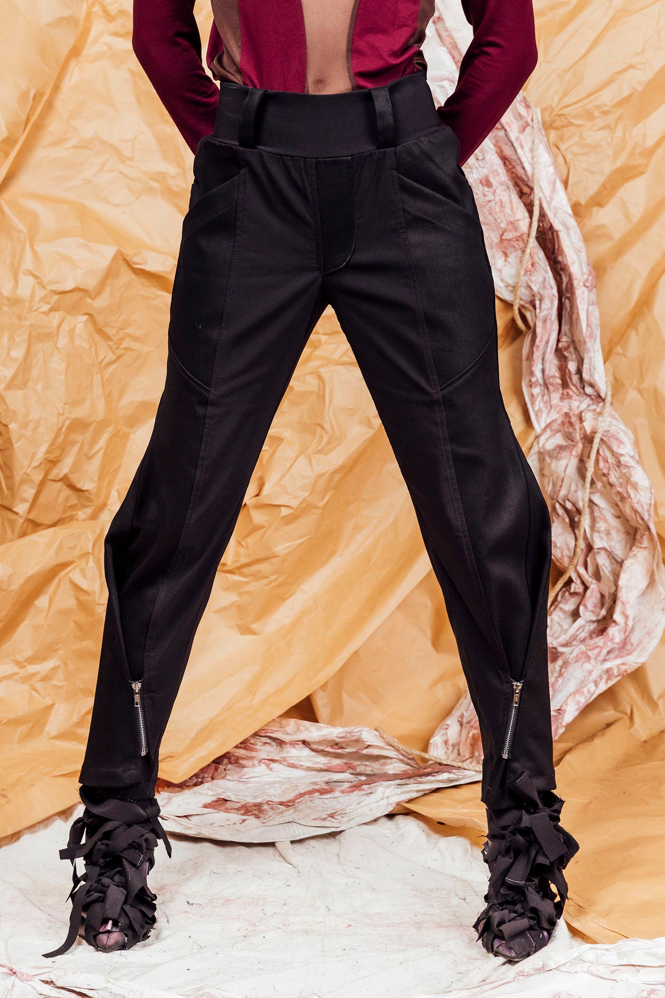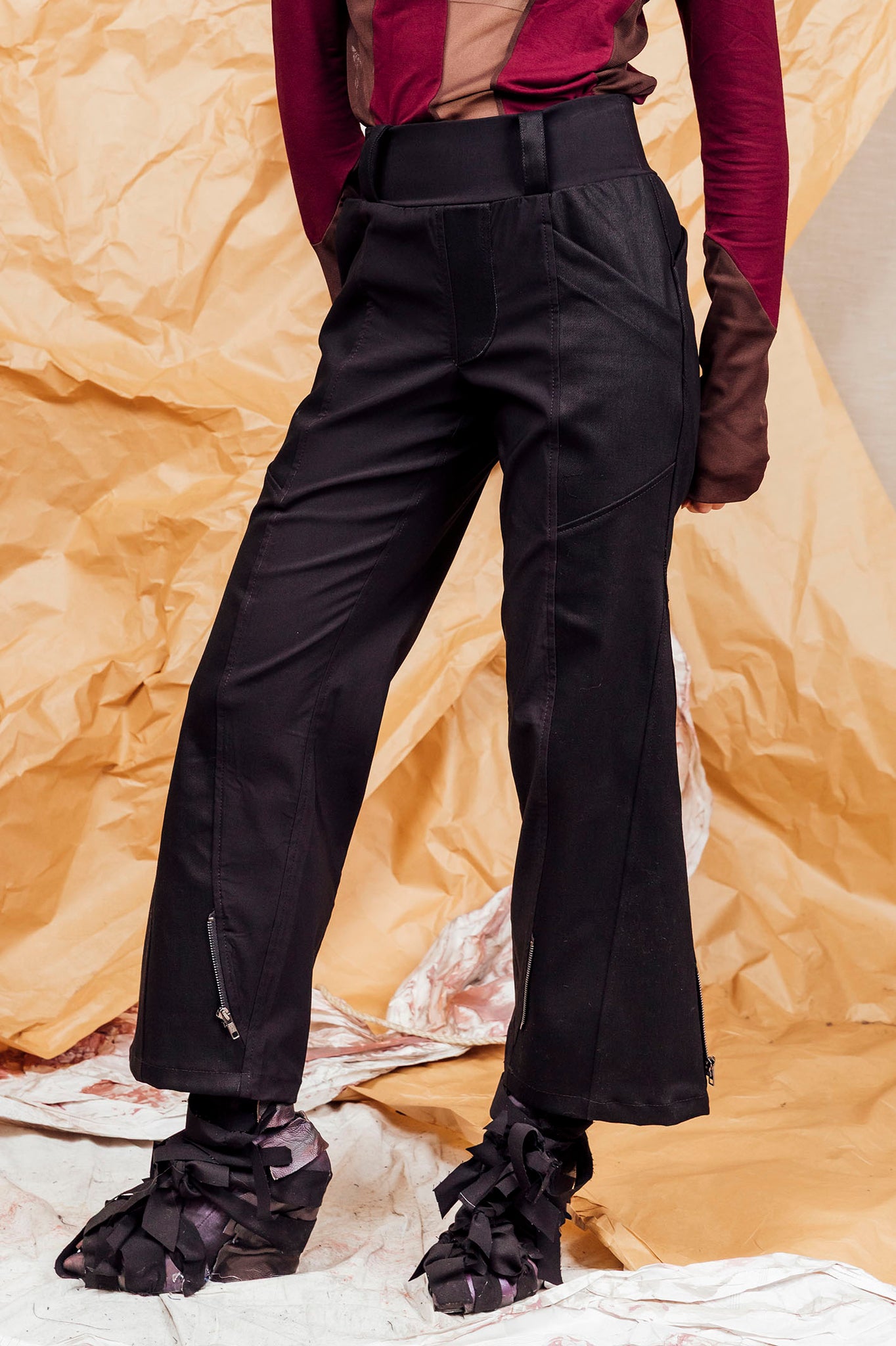 - Angled metal zip closures at the ankle transform the bootcut flare into a tapered leg.