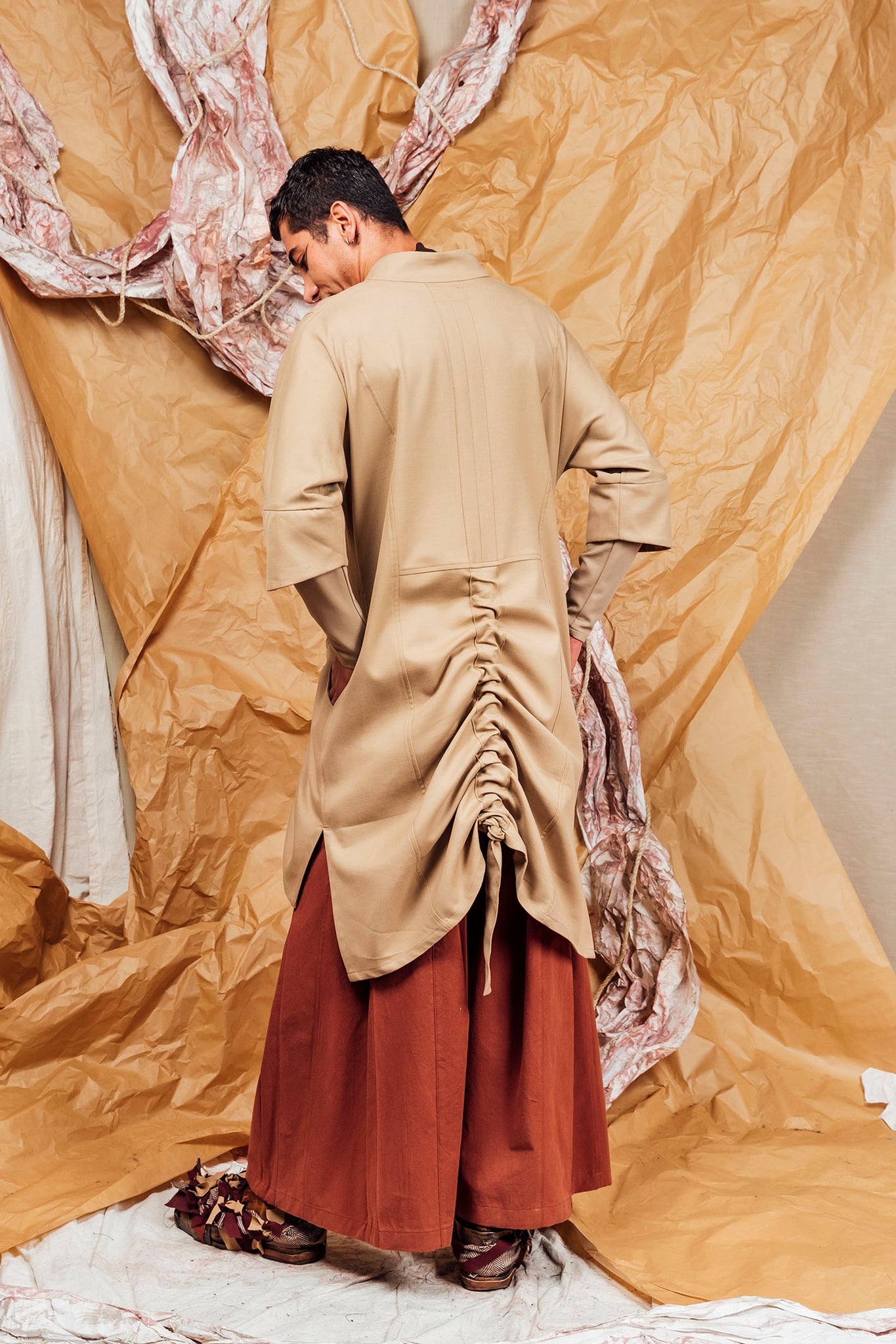 • Adjustable front and back encased ties allows the wearer to ruche and sculpt the jacket to their desired length and style.