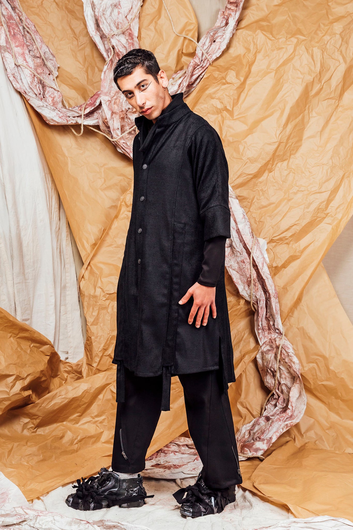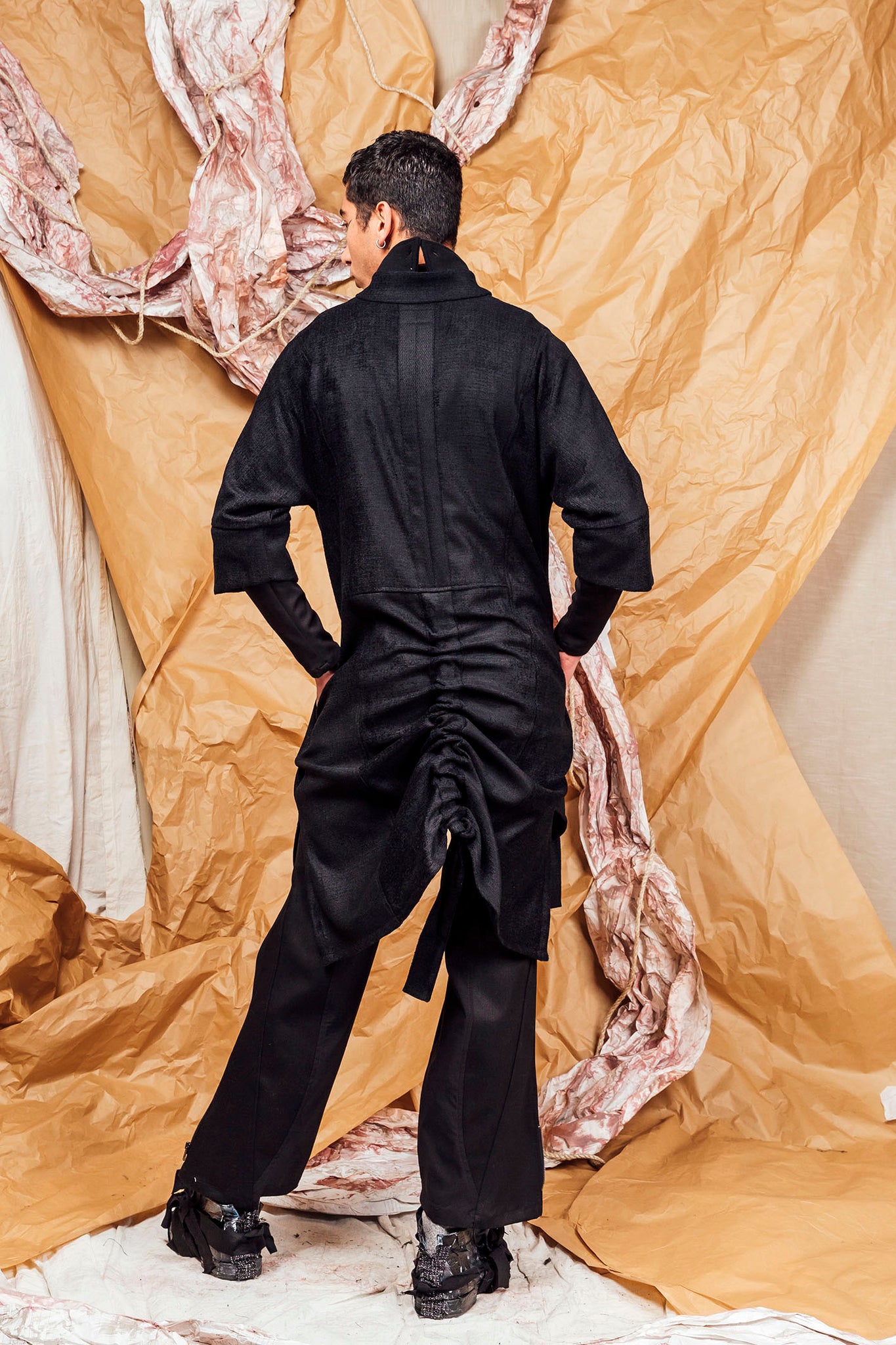 • Adjustable front and back encased ties allows the wearer to ruche and sculpt the jacket to their desired length and style.