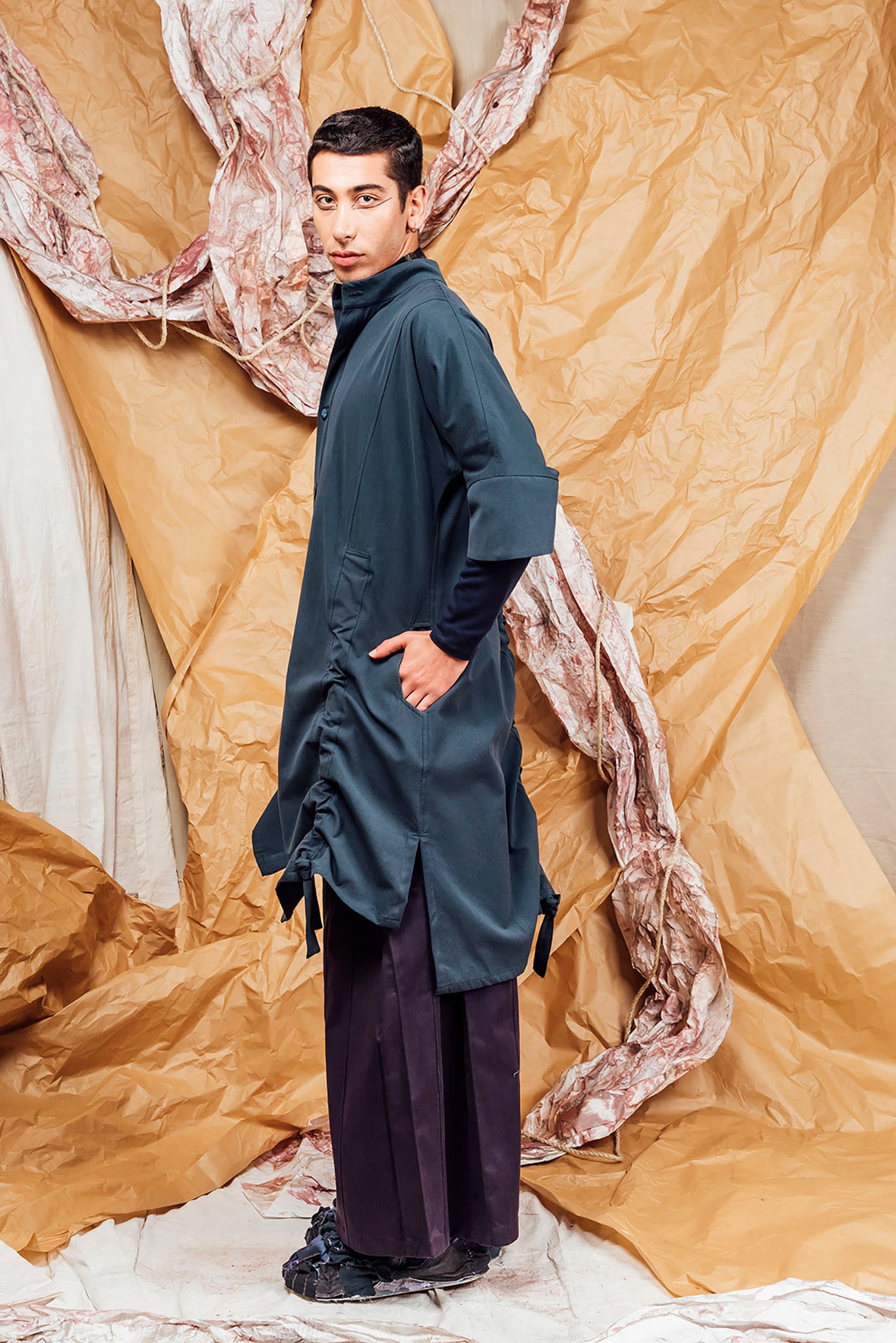 • Adjustable front and back encased ties allows the wearer to ruche and sculpt the jacket to their desired length and style.