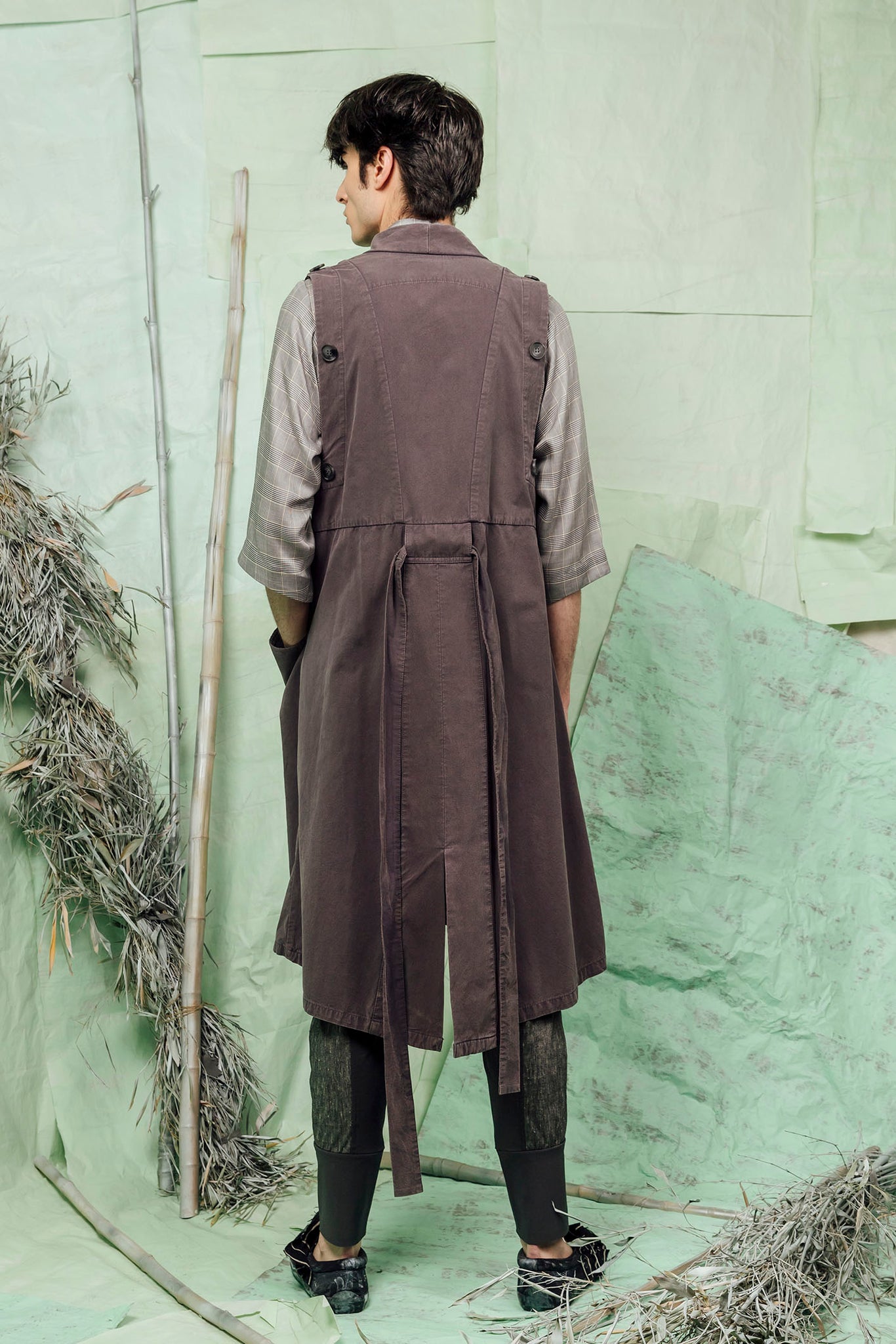 The AKIYA Jacket is an incredibly versatile and innovative addition to your JUDE wardrobe. It converts effortlessly from a trans-seasonal trench style jacket to a long duster vest with button off kimono sleeves, making it uniquely multi-functional.